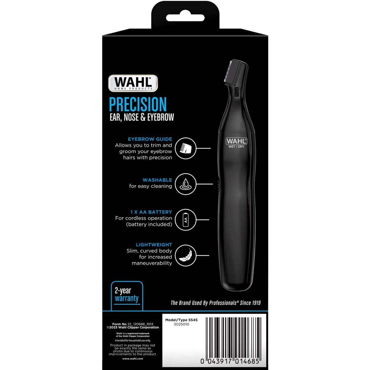 The Wahl Precision Ear, Nose & Brow Hair Trimmer provides you with ultimate power and precision for pain-free personal trimming. Designed with a vertical trimming head, the perfect angle delivers a smooth and close-cut whether you are trimming your ear, nose or eyebrow hair. You can easily get that fresh, well-groomed look without stepping out of the comfort of your own home!