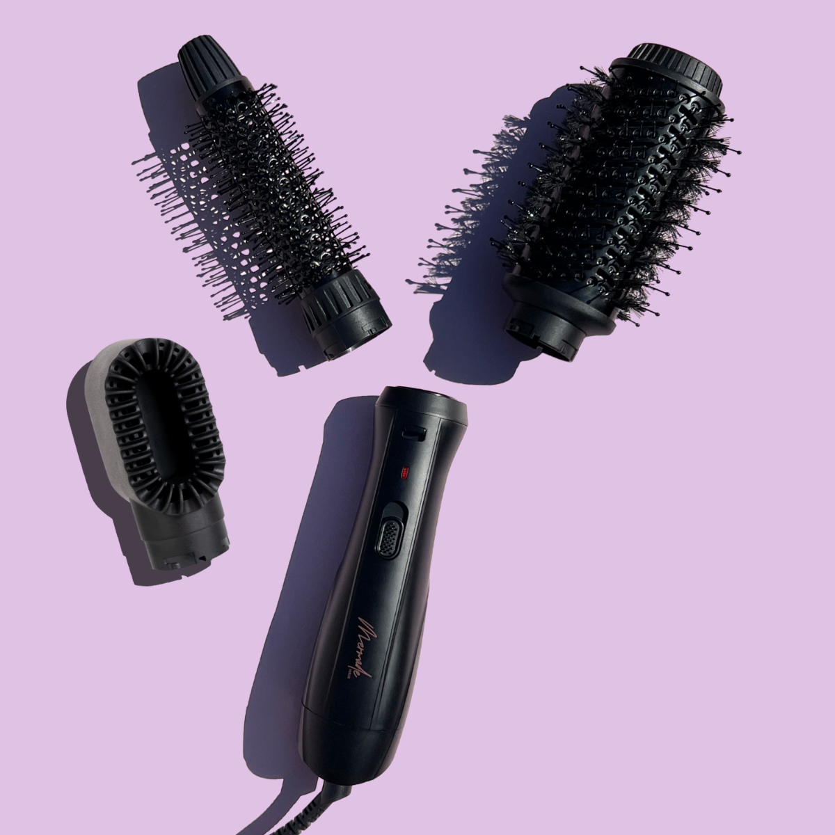 The best-selling Interchangeable Blow Dry Brush by Mermade Hair is now available in black! One tool, three heads, endless hair possibilities. First, use the pre-styling dryer attachment to dry roots and remove excess water. Then, take your pick. The Volume Head (60mm) oval attachment for epic curves and bounce, or the Curling Head (32mm) round curling barrel for effortless loose curls. And the best part? This all-in-one tool easily packs into your suitcase for on-the-go styling. Say goodbye to bad hair days, and hello to the blowout of your dreams!