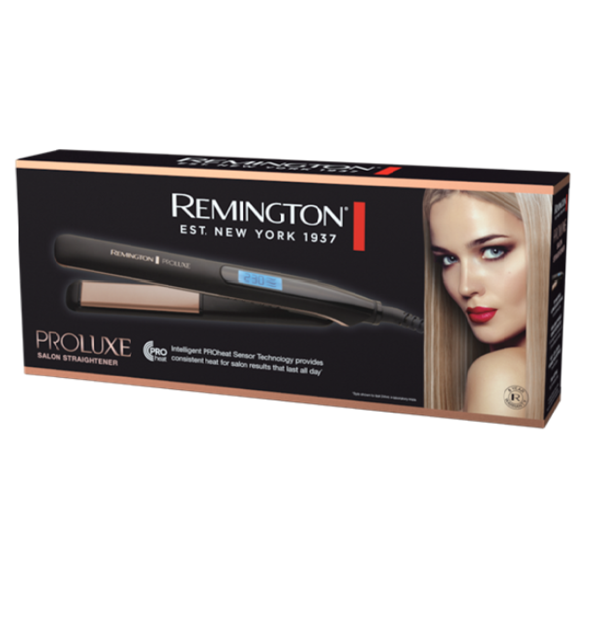 Achieve salon results that last all day* with the Remington PROLUXE Salon Straightener.This high performance salon straightener features Intelligent PROheat Sensor Technology which delivers consistent heat as you're styling from root to tip, allowing you to achieve 47% straighter hair in one pass** and professional results that take you from day to night*. The Ultimate Glide Ceramic plate is 5x smoother† for an effortless glide and contains 15x more ceramic† for superior even heat. The ultimate fast heat up time of 10 seconds is perfect for when you are in a hurry, whilst the variable temperature settings to 230°C and 3m professional power cord provide you with total styling control. * style shown to last 24 hours in laboratory trails ** vs. standard Remington straightener †vs. standard ceramic coating