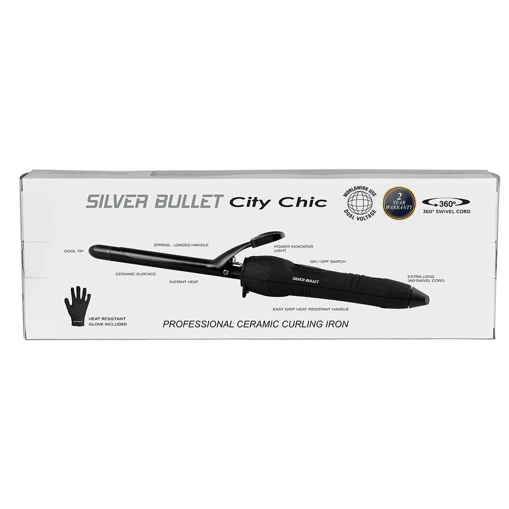 The new Silver Bullet City Chic Ceramic Curling Iron 13mm heats up instantly for super shiny, longer lasting curls. Ceramic technology locks curls in place and smooths the hair cuticle, creating tight spiral curls and ensuring your luscious curls last. Thick, coarse and extra stubborn hair is no match for Silver Bulletโs City Chic Curling Iron 13mm! The smooth, ceramic surface creates beautiful, uniform curls as it heats up quickly and evenly โ no damaging hot spots or temperature spikes! Frizz free curling is now quicker and easier than ever with Silver Bullet