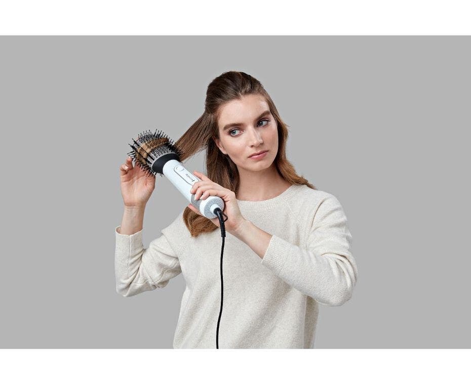 - The specialised oval barrel with mixed bristles lifts your hair close to the root for maximum volume.
