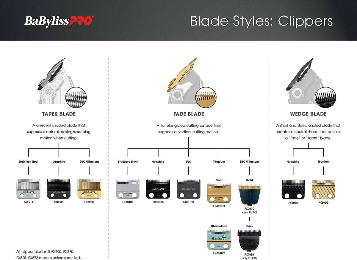 Experience expert influence. BaBylissPRO Replacement Hair Clipper Fade Blade Black FX8010B is designed to be used on any of the BaBylissPRO Lithium Hair Clippers. This exceptional fade blade has a very flat surface compared to a traditional taper blade, getting much closer to the scalp. More personal control over “C” scooping when blending hair. Graphite PVD coating
