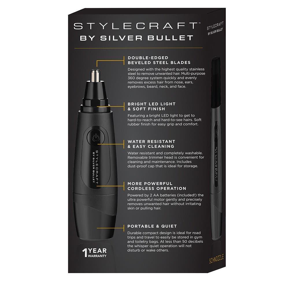 Ultra-portable, powerful and whisper quiet. StyleCraft by Silver Bullet Schnozzle Nose and Ear Hair Trimmer is a micro multipurpose trimmer great for on-the-go. The 360 degree trimming system quickly and easily removes unwanted hair from nose, ears, eyebrows, beard, neck and face. Powered by two AA batteries (included), the mighty motor gently and precisely trims hairs without pulling. Double-edged, bevelled stainless steel blades of superior quality. Bright LED light helps navigate hard-to-see hairs. 100% water-resistant. Whisper quiet operation for use anywhere, anytime