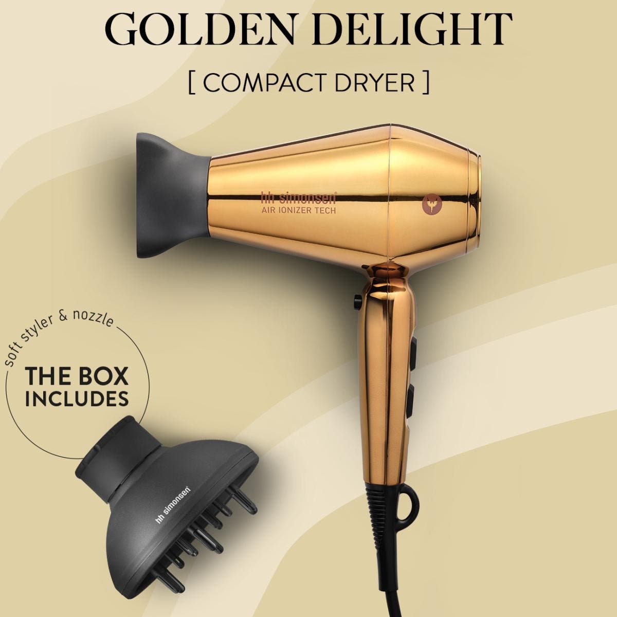 HH Simonsen Compact Hair Dryer and Diffuser are a divine pair. This limited edition set in Golden Delight unites both luxury and performance. The compact, ultra-lightweight and ergonomically balanced hair dryer is impressively performance-driven with a professional, long-life 2100 watt DC motor. This surprisingly quiet hair dryer features a super strong airflow up to 25% stronger than traditional hair dryers. 2 heat/airflow settings suit all hair types, while ionic technology eliminates frizz. The unique diffuser enhances curls with innovative air ducts and nozzles. Danish design at its very best