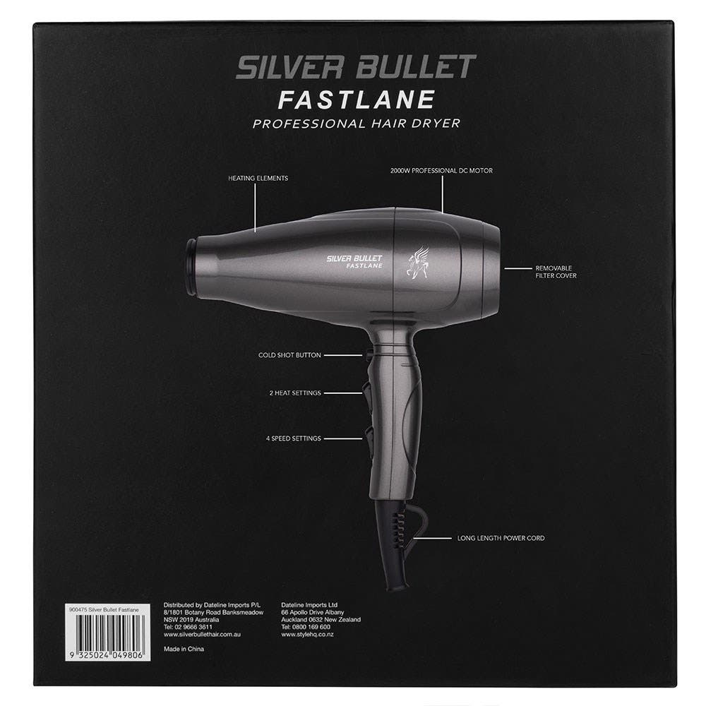 Get in the fast lane with Silver Bullet. The Silver Bullet Fastlane Professional Hair Dryer is a styling superstar. With powerful airflow and a long-lasting DC motor, this hair dryer delivers fabulous results fast. 4 speed and 2 heat settings ensure the needs of all hair types are met. Dry hair quicker with this mighty hair dryer!