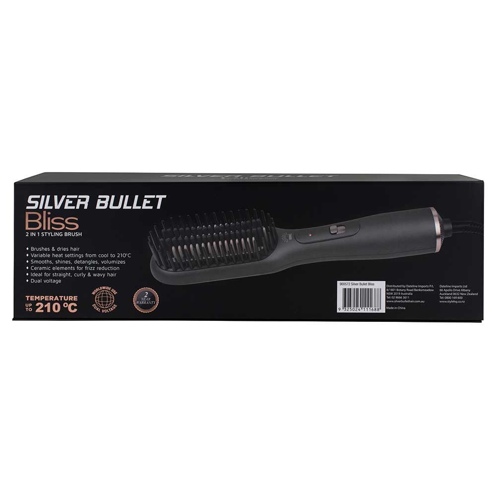 The 2 in 1 hot air straightening brush which delivers styling bliss. Silver Bullet Bliss 2 in 1 Styling Brush simultaneously dries and styles hair, giving you the power of a brush and hair dryer in one ultra-fast, easy tool. The result? Stunningly smooth, shiny, detangled and volumised.