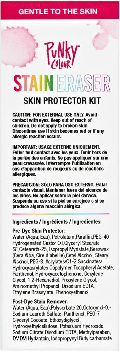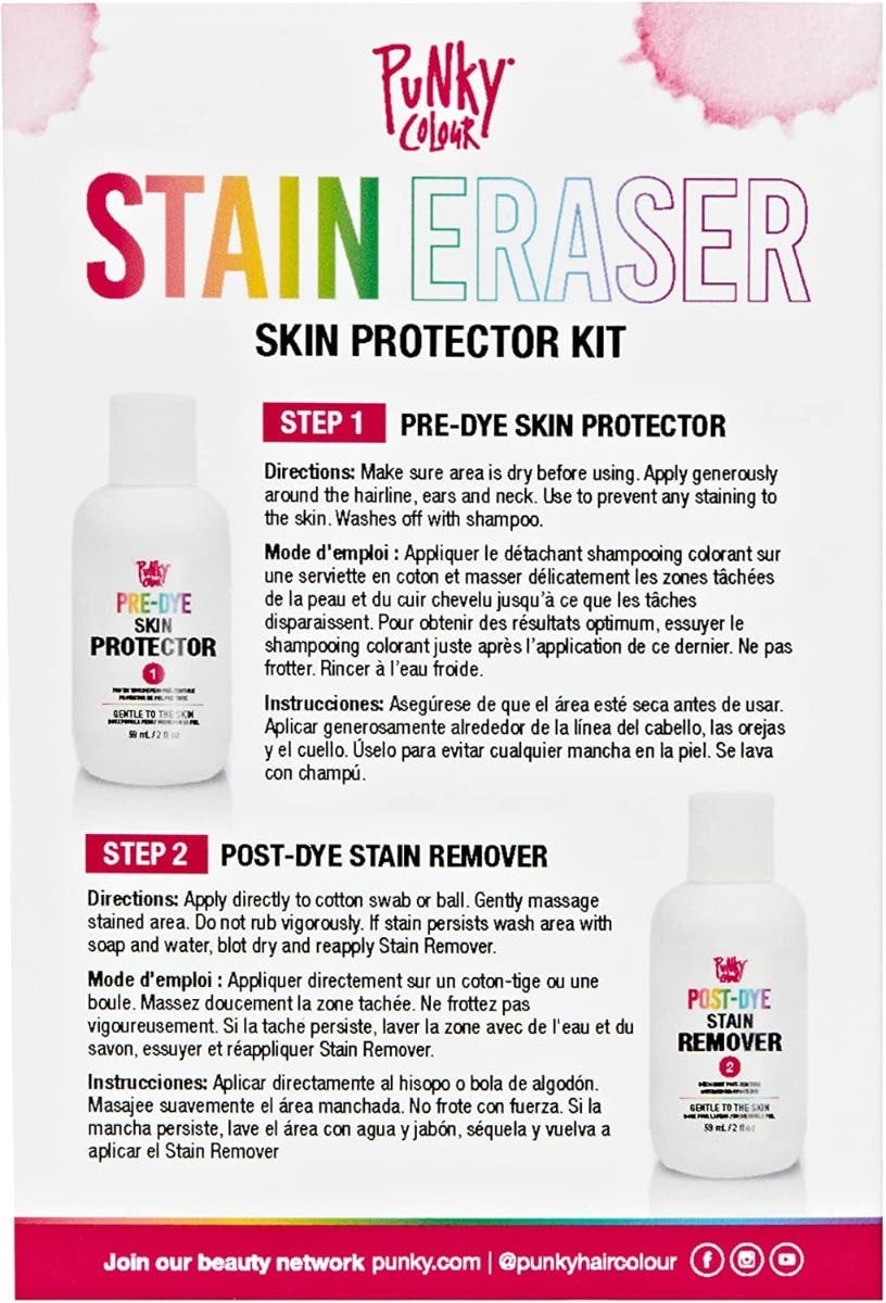 - Goodbye to Stains: Worry-free wild colour adventure! Get your colour game on with this Punky Colour Skin Protector Kit. It's so easy! Simply apply the Pre-Dye Skin Protector before colouring, this creates a barrier between your skin and dye. Once your colour session is complete, use the Post-Dye Stain Remover to effortlessly erase any lingering traces of colour on your skin. Rock your new vibrant hair with confidence knowing your skin remains healthy and glowing!