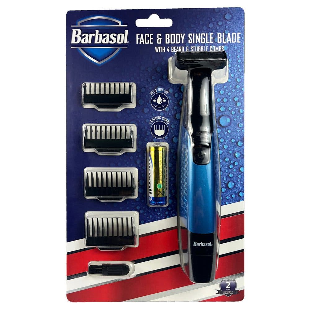 The Barbasol Power Single Blade provides a close stubble shave with the use of shaving cream or gel or can be used dry as a grooming tool. The stainless steel blades deliver a close, comfortable shave while the 4 comb guides refine and style sideburns and facial hair.