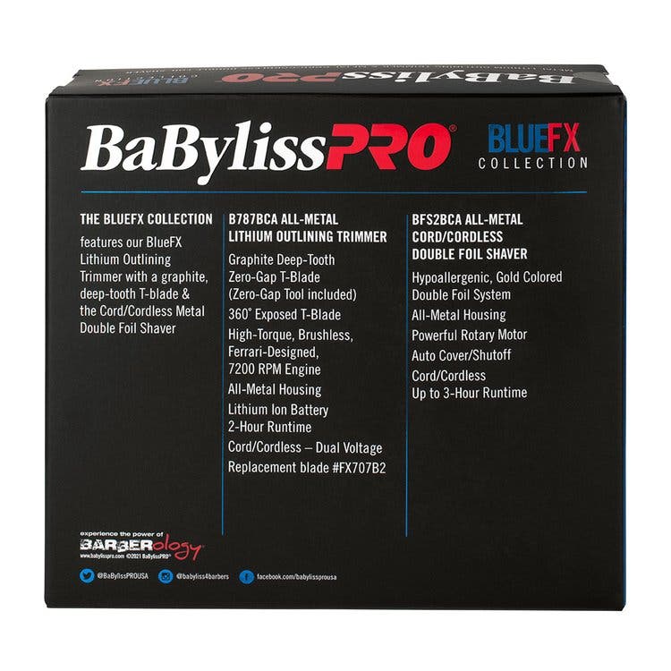 Experience the combined power of Barberology. Double the power, double the performance. BaBylissPRO BlueFX Outliner Trimmer and Shaver Duo is a dynamic duo in blue. With Ferrari-designed 7200 rpm motor, BaBylissPRO BlueFX Lithium Outliner Trimmer is high torque and high performance, perfectly suited to all detail work. The graphite, deep-tooth, zero-gap T-blade delivers extraordinary precision. BaBylissPRO BlueFX Double Foil Shaver is the perfect partner with close-cut performance. Ultra-fine, hypoallergenic titanium foils and an incredible 180 minutes of cordless runtime