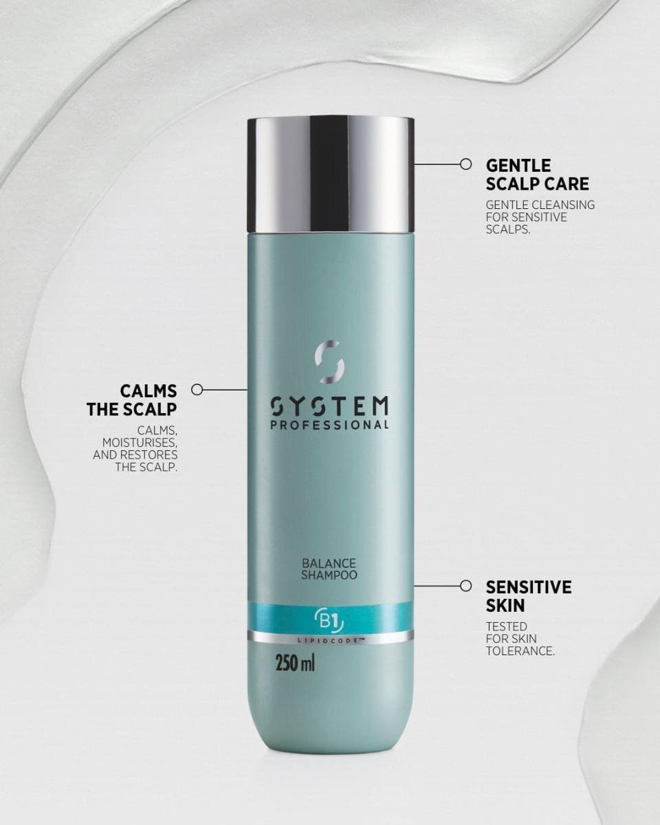 System Professional Balance Shampoo 250ml is a gentle scalp care shampoo that moisturizes the hair and scalp without drying it further. This shampoo is perfect for clients with a sensitive scalp that need daily gentle cleansing. Its skin-friendly pH and gentle surfactant system ensure that the scalp is cared for and moisturized, while calming ingredients soothe any irritation. The shampoo does not dry out the hair or scalp, leaving it feeling soft and healthy