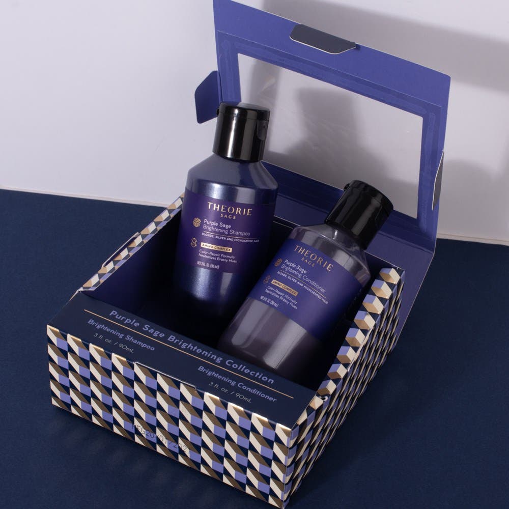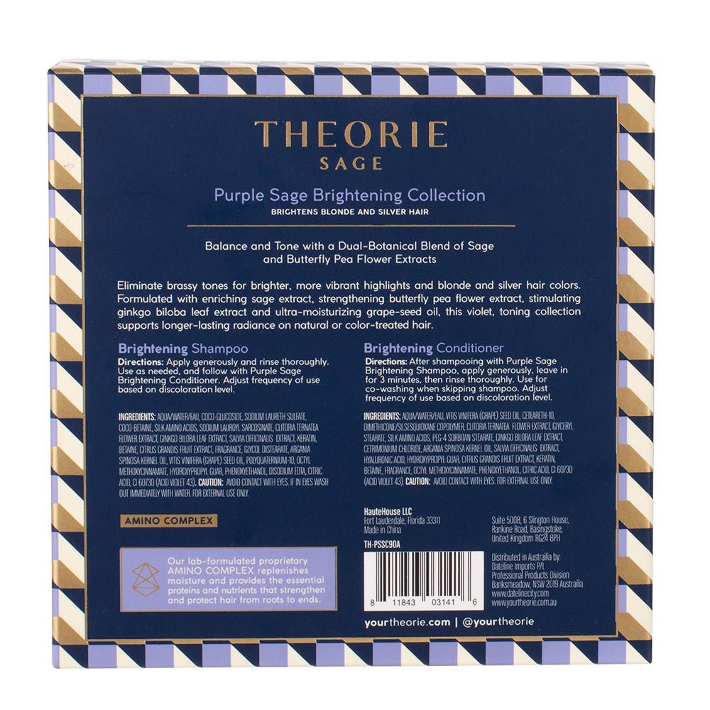 Brighten blonde and silver hair. Theorie Purple Sage Brightening Travel Pack supports radiance and eliminates brassy tones for brighter, more vibrant highlights, blonde and silver hair colours. Violet-toned formulas boosted with encircling sage extract, strengthening butterfly pea flower extract, stimulating ginkgo biloba leaf extract and ultra-moisturising grapeseed oil for long-lasting results. Great for travel and gifts.