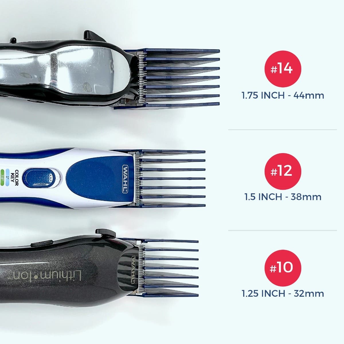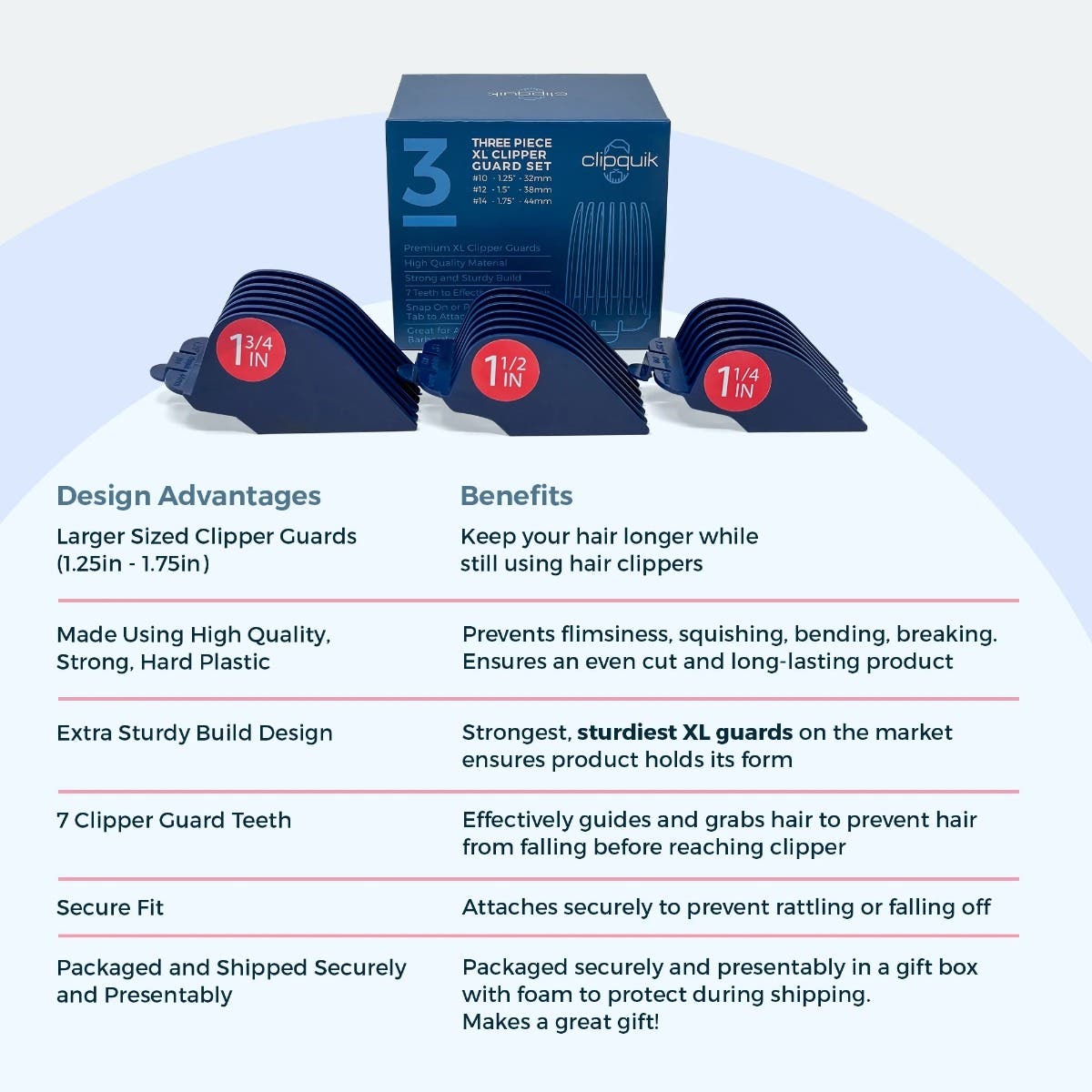 • LENGTH: Clipquik Premium XL Clipper Guard set includes 1.75 inch/44mm (#14),1.5 inch/38mm (#12),1.25 inch/32mm (#10)