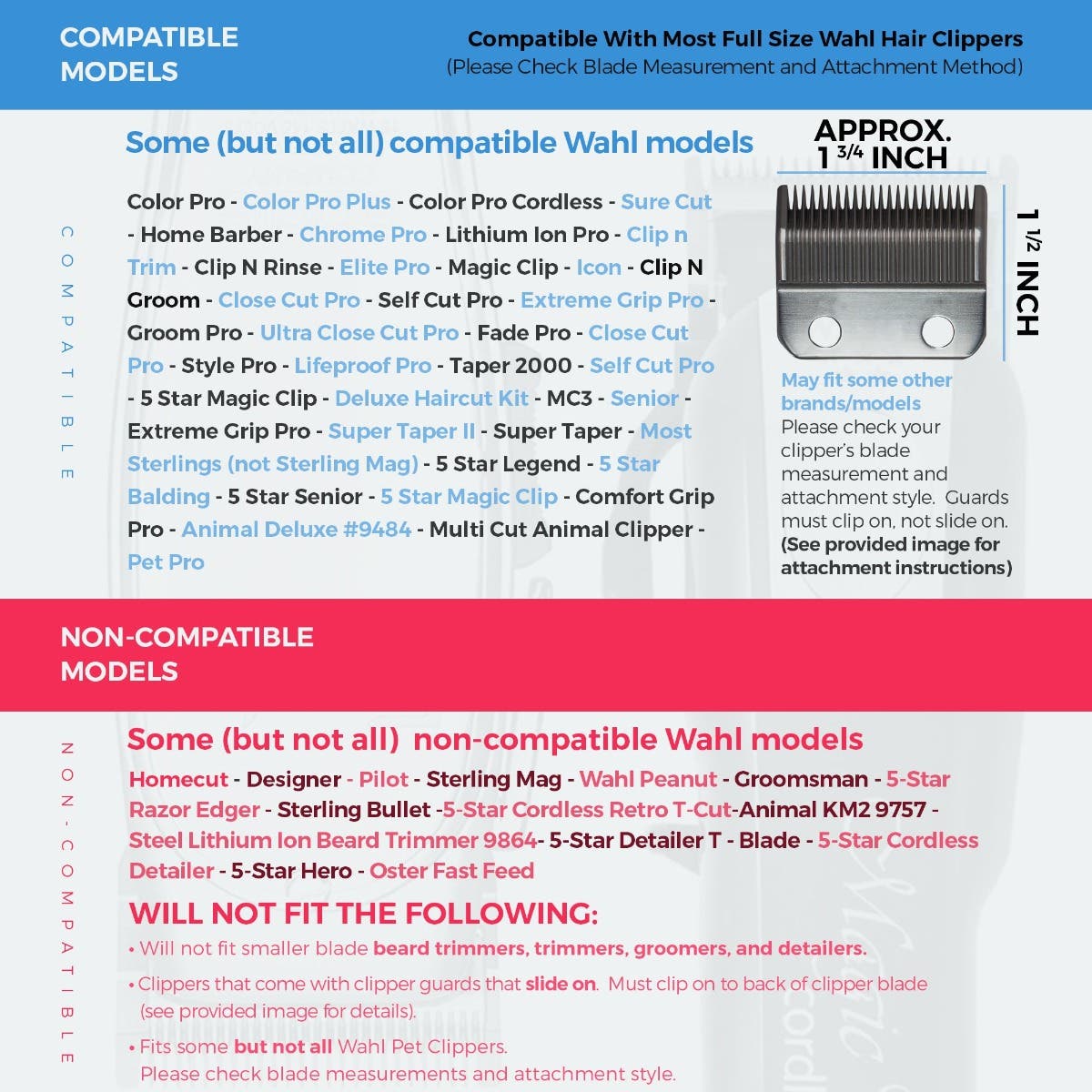 • COMPATIBILITY/ATTACHMENT: Clipquik guide combs attach by "clipping on" to the back of the clipper blade. They do not "slide on." These guards fit the same clipper models as the Wahl #10 and #12 guards.