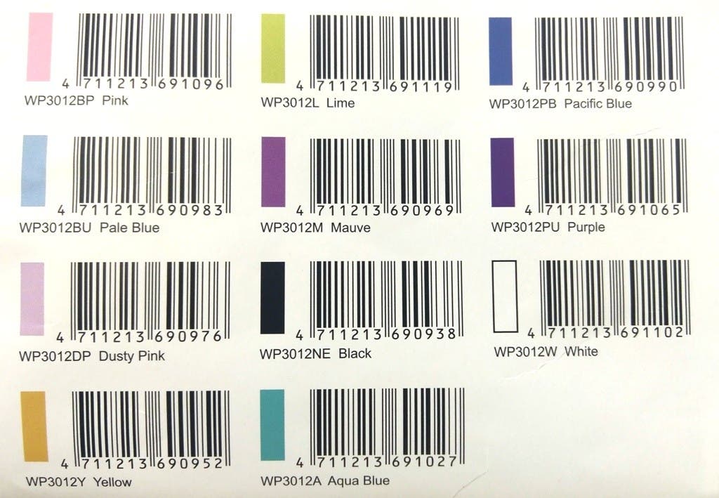 - 7 Colours: Black, Mauve, Dusty Pink, Pale Blue, Pacific Blue, Purple, White