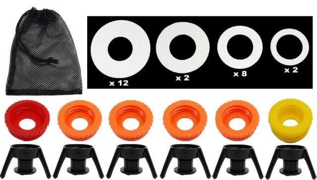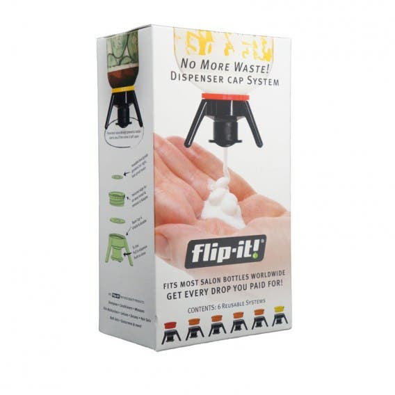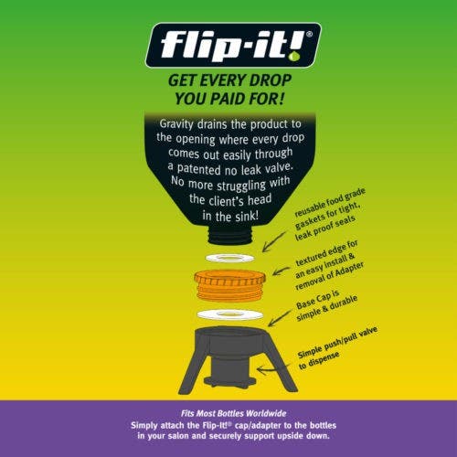 12 Piece Salon Kit Includes 6 BLACK Flip-It Dispensing Stands, which can be used alone on bottles with XL necks, or used with one of the Adapters for bottles with smaller neck sizes (includes 1 Large, 1 Small and 4 Medium Adapters, plus 2 sets of re-usable leak proof gaskets) and free storage mesh bag