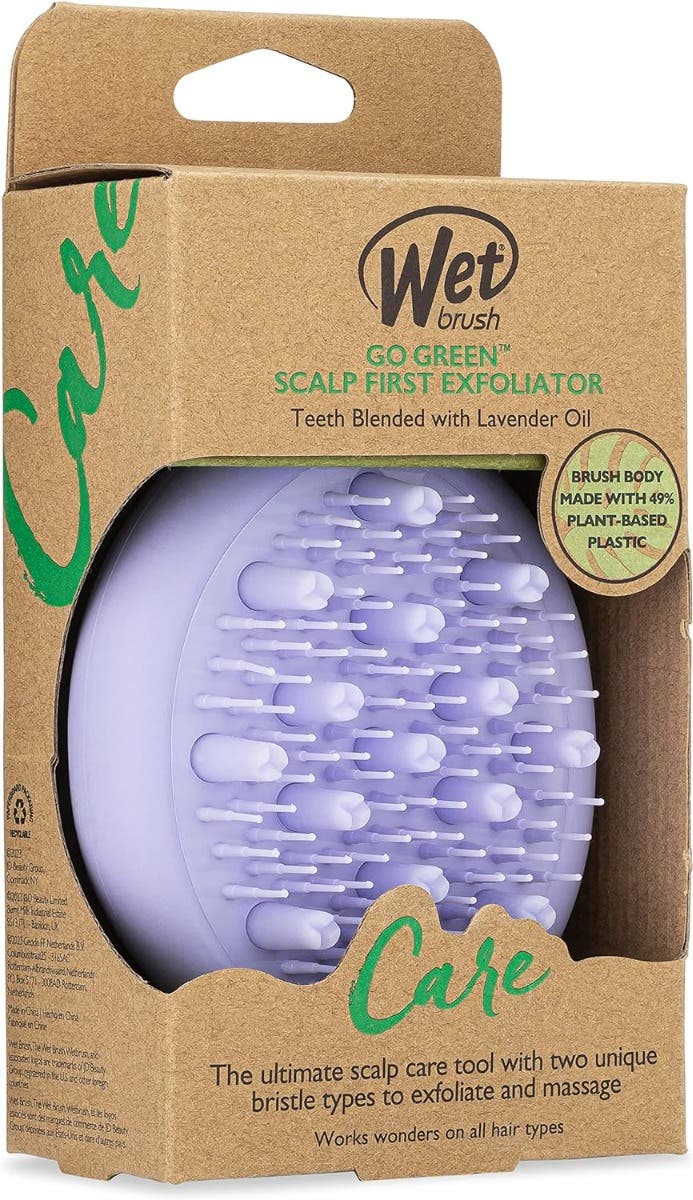 Meet the Wet Brush® Go Green™ Scalp First Exfoliator Create a spa-like experience at home with this scalp exfoliator and massager blended with trace amounts of lavender oil. Its brush body is made with 49% plant-based plastic. The rope hook allows you to conveniently hang it in your shower