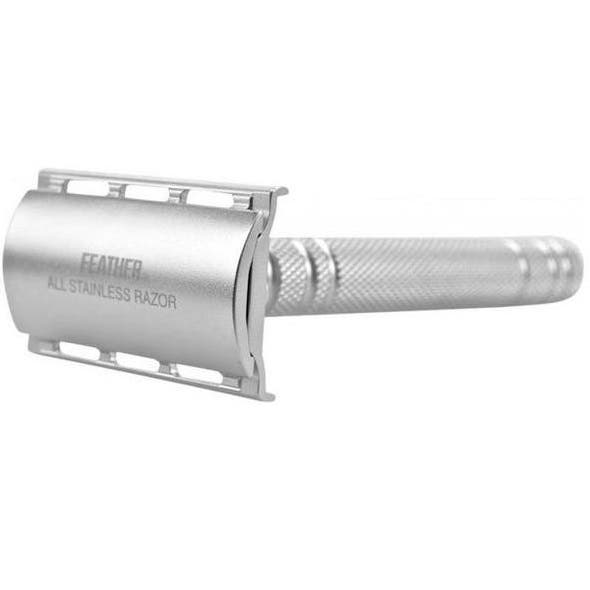 The Feather AS-D2S 'All Stainless' Safety Razor with Stand is a precision built tool of the highest quality. This 3-piece razor is made entirely out of satin finished stainless steel and includes a matching stand. While it will hold any blade, it has been specifically engineered for use with the extremely sharp Feather blades. The long 90mm handle feels solid and well balanced and provides a secure grip for wet hands.