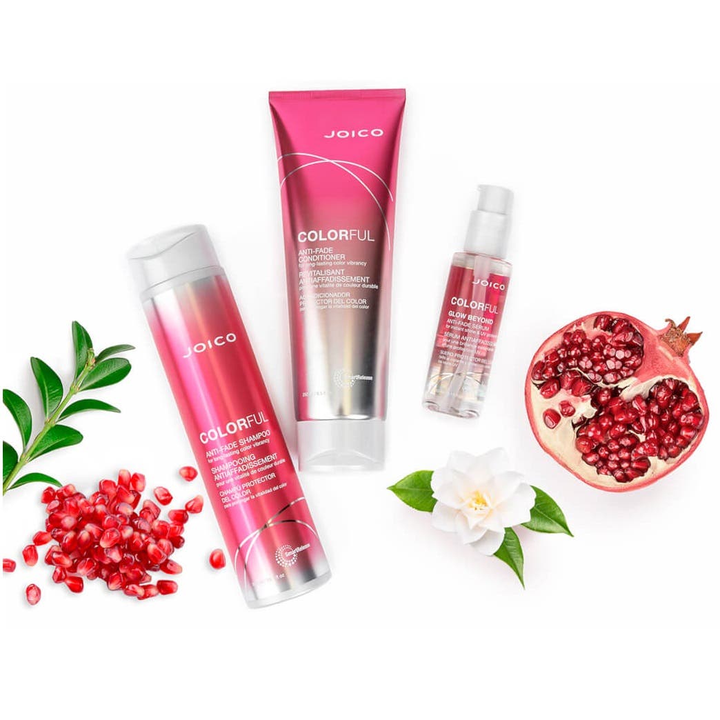 - Joico Colorful Glow Beyond Anti-Fade Serum 63ml: Imagine an instant, noticeable, stunning hit of vibrancy – the kind of punch that boosts the brilliance of haircolor. That’s what you get with Glow Beyond, the anti-faded serum that puts the spotlight on radiance, while helping to protect hair against harsh, color-fading UV rays. Formulated with rich Camellia Oil and Pomegranate Fruit Extract, this glossing serum highlights and helps prolong the freshness of fabulous haircolor.