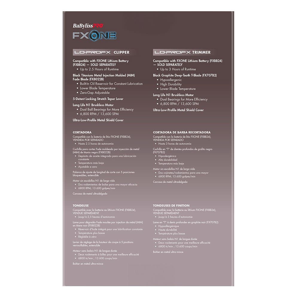 The combined power of FXONE! BaBylissPRO FXONE LoPROFX Hair Clipper and Hair Trimmer in limited edition Nightfall are an indispensable pair. Part of the FXONE ecosystem based on ONE battery, this duo will revolutionise the way you work. BaByliss PRO FXONE LoPROFX Hair Clipper is a high performance, ultra-low profile clipper compatible with the FXONE battery. Long-life N1 6,800 rpm brushless motor, ultra-thin black titanium Metal Injection Moulding (MIM) fade blade, zero gap adjustable and 5 detent locking stretch taper. BaBylissPRO FXONE LoPROFX Hair Trimmer is high strength with ultra-low profile and black graphite deep tooth T-blade. Both tools are ultra-low profile for a beautifully intuitive feel